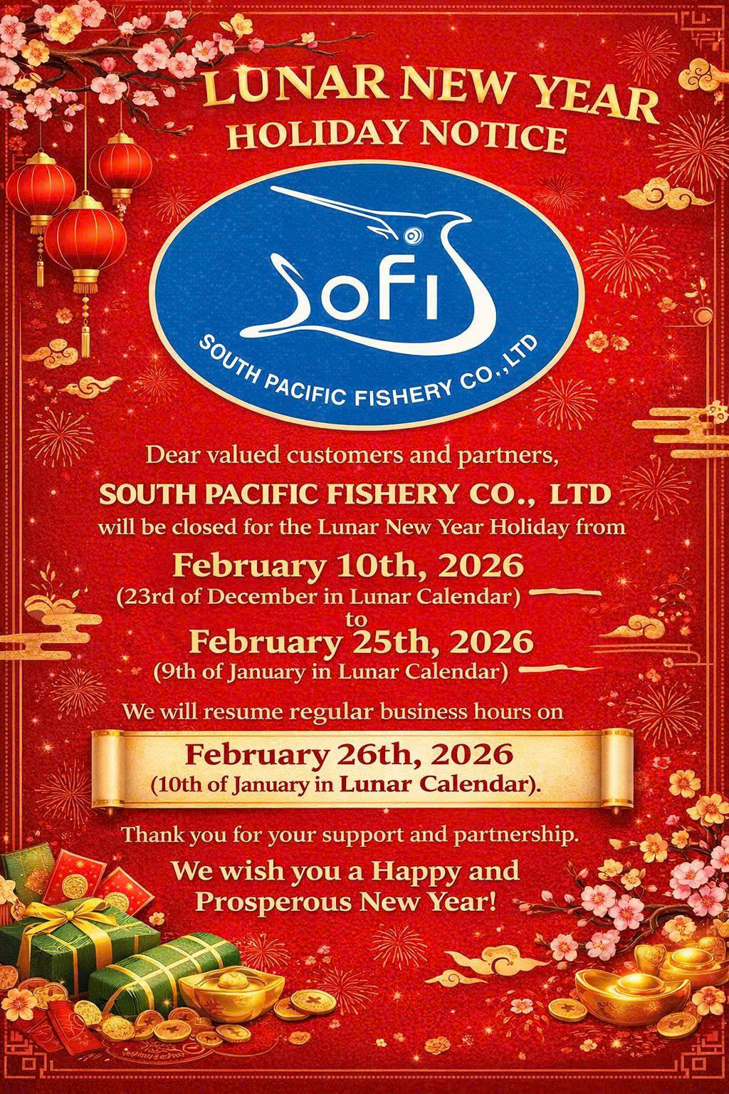 In celebration of the Lunar New Year, South Pacific Fishery Co., Ltd will be closed from February 10th, 2026 to February 25th, 2026.